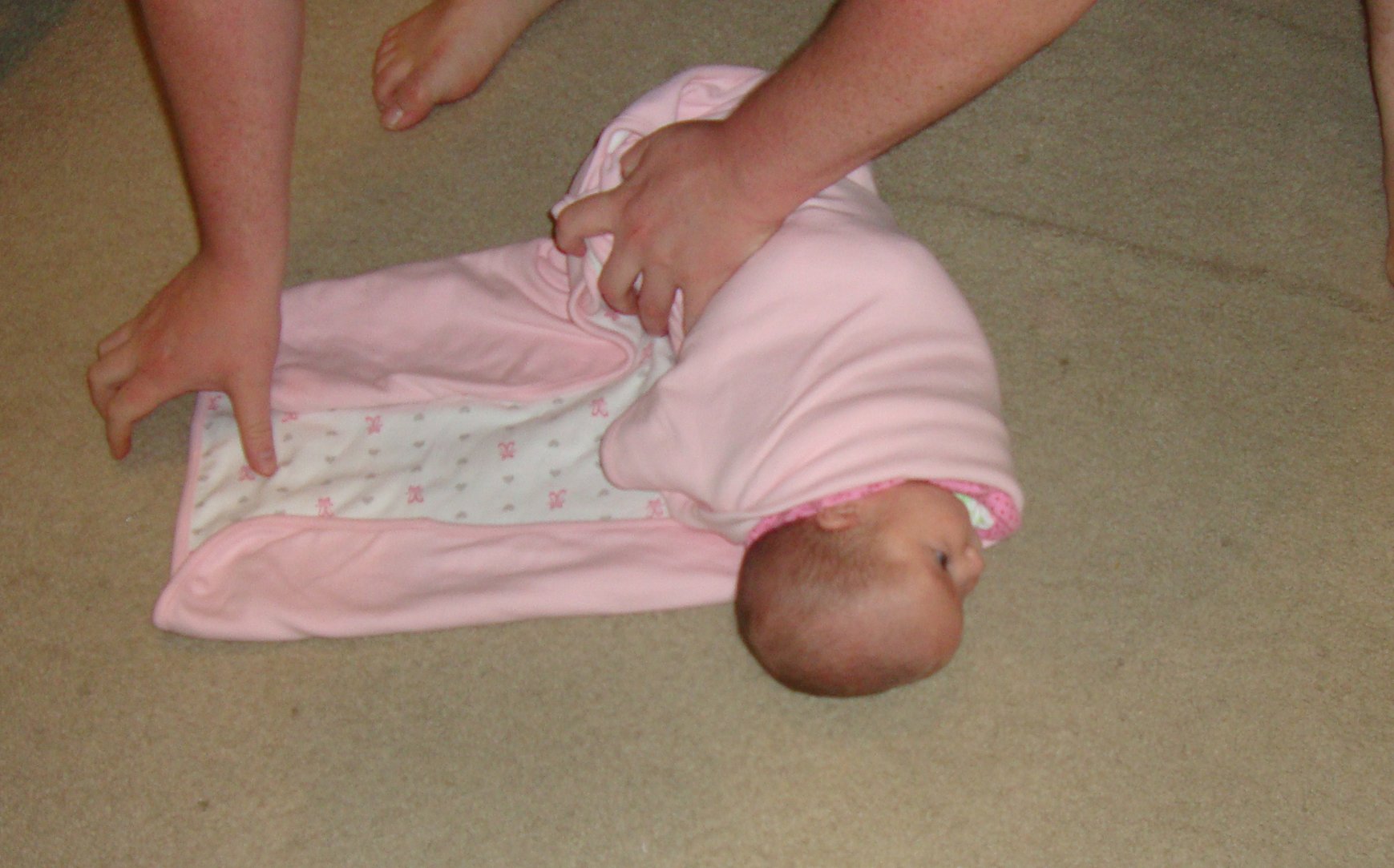 Swaddling is simple, but takes some practice. Lay a blanket on a flat surface and fold down the top corner about six inches to form a straight edge. Place your baby on his back so that the top of the fabric is at shoulder level. Bring your baby’s left arm down. Pull the corner of the blanket near his left hand over his arm and chest, and tuck the leading edge under his back on his right side. Bring your baby’s right arm down. Pull the corner of the blanket near his right hand over his arm and chest, and tuck the cloth under his left side. Twist or fold the bottom end of the blanket and tuck it loosely behind your baby, making sure that both legs are bent up and out from his body, his hips can move, and his legs can spread apart naturally.